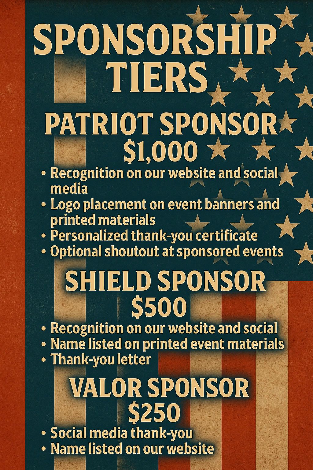 We are deeply grateful to our sponsors whose generosity helps make the Liberty & Valor Foundation’s mission possible. Their support allows us to honor and serve veterans, police officers, firefighters, and correctional officers through community programs and events.